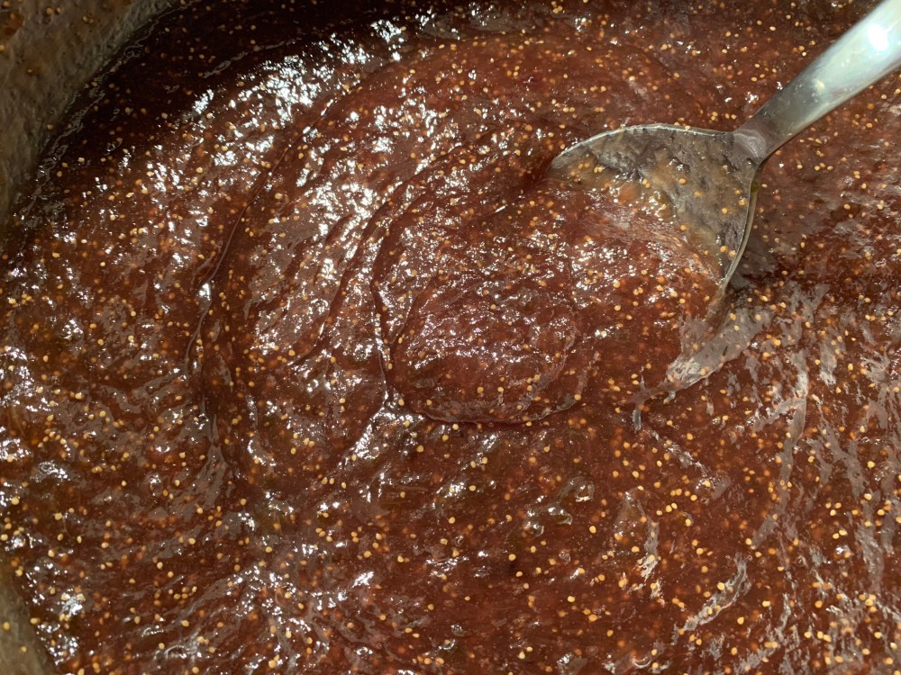 En revenant à mes figues, j’ai mis la casserole sur le feu et fait cuire pendant une heure environ, en mélangeant de temps en temps. Cela bouillait légèrement, en formant des petites bulles sur le dessus.
