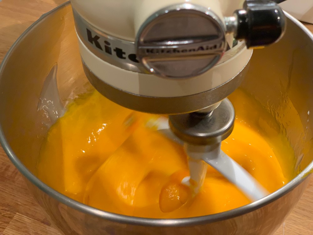 Dans le bol de mon robot, je mélange les œufs et le lait concentré sucré. J’ajoute la purée de potimarron et les épices.