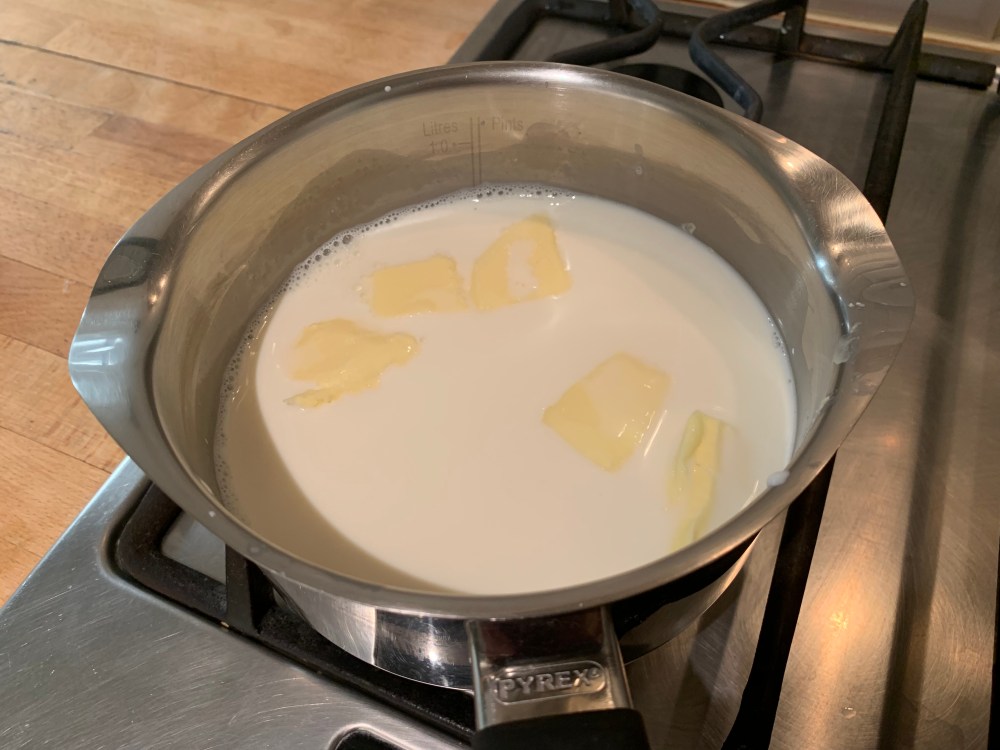 Faire chauffer le lait et le beurre jusqu’à ébullition.