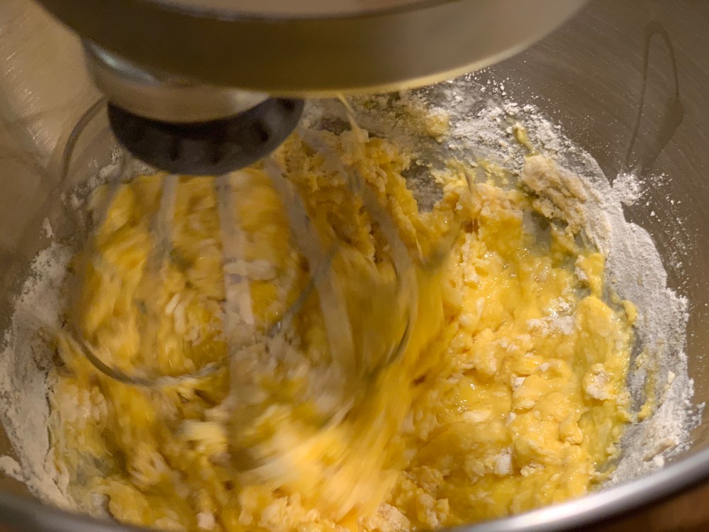 Pendant ce temps, mélanger les deux œufs + les deux jaunes avec la farine.