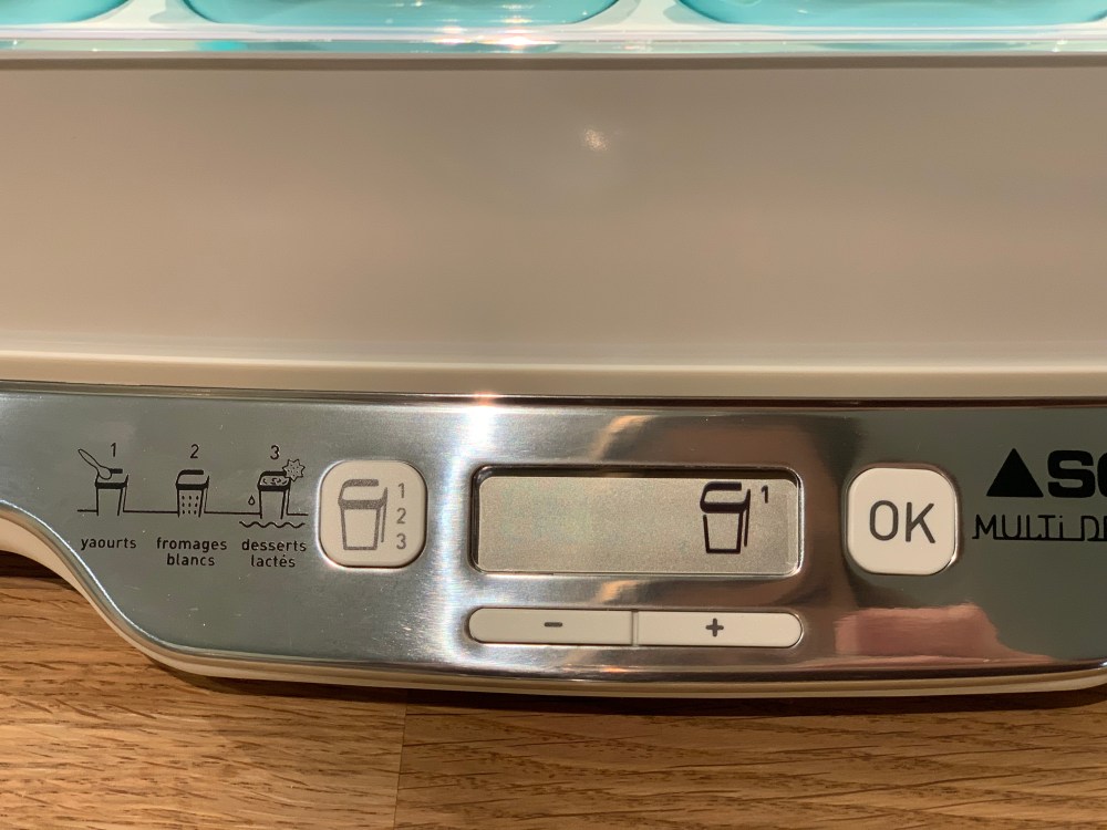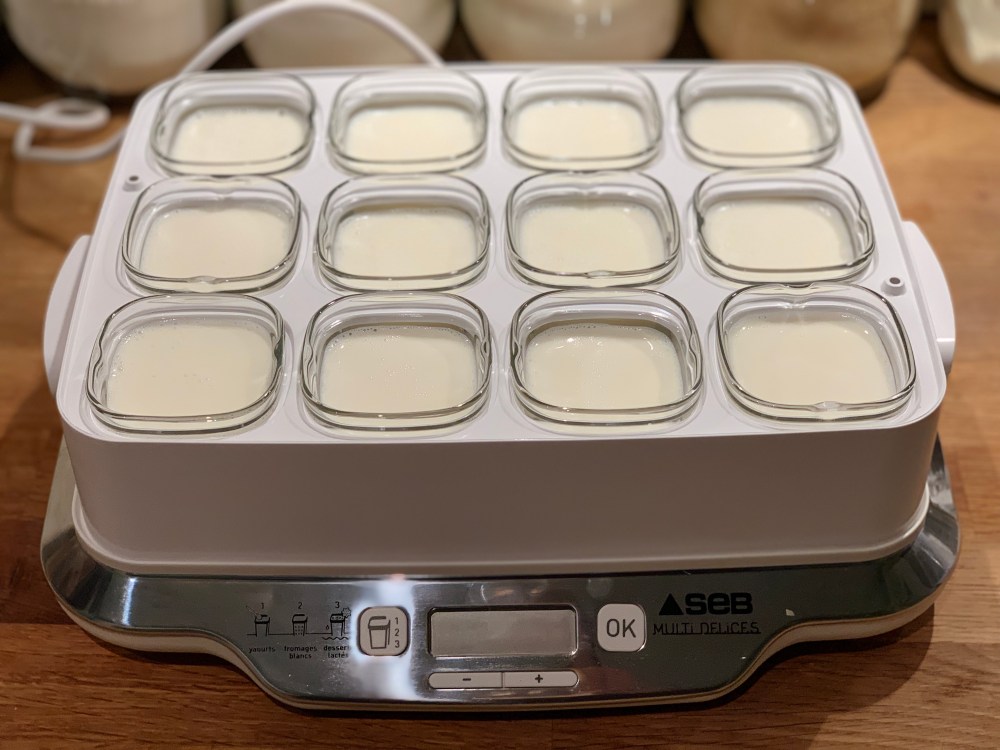J’ai acheté un modèle 12 pots (et heureusement pas 6, à la vitesse à laquelle ils partent!), il y a les programmes prévus pour y faire des yaourts, du fromage blanc, des crèmes dessert, des fromages frais… mais je m’en sers pour préparer la recette la plus basique qui soit: le yaourt au lait de vache.