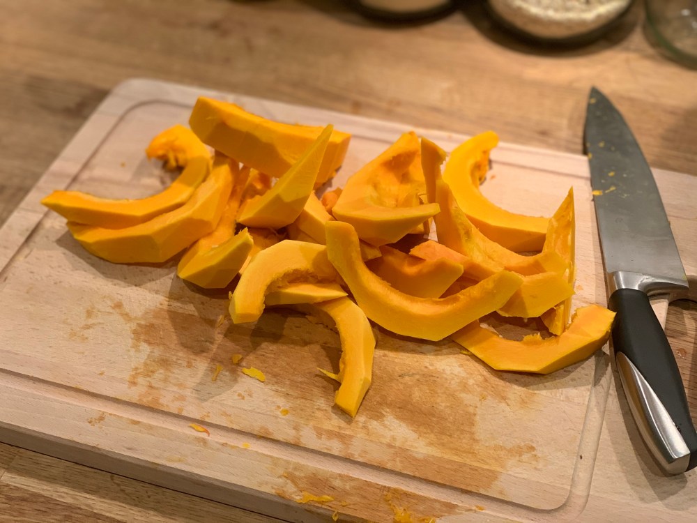 Couper le potimarron en dés. D’abord le couper en deux – sans perdre une partie de son corps – puis en 4.