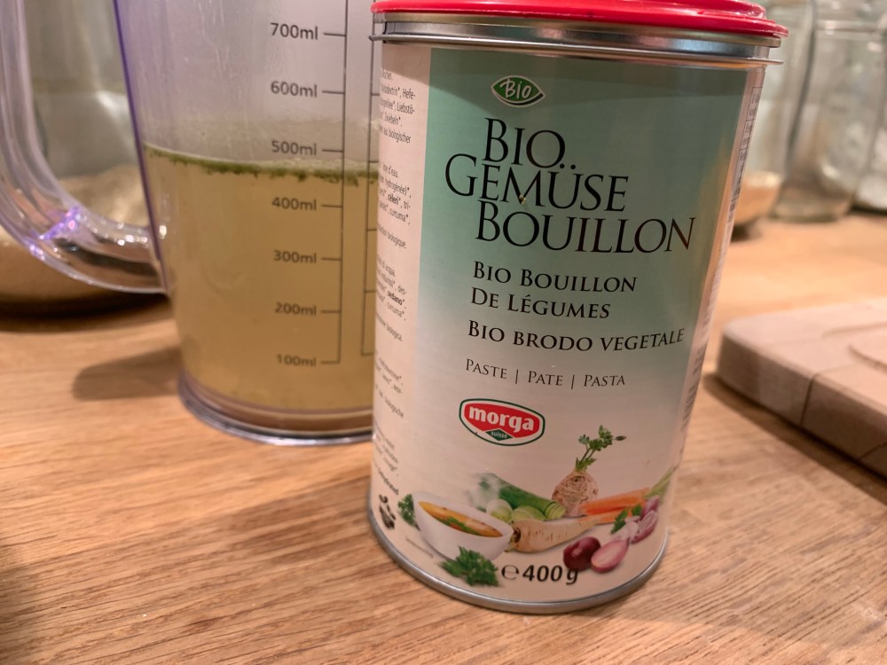 – 500ml de bouillon (500ml d’eau + 1 càc de pâte pour bouillon ou un bouillon cube)