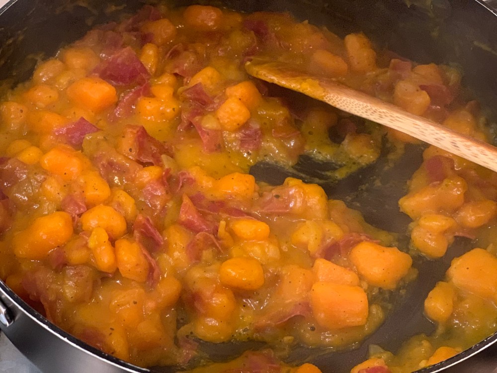 Couper un oignon en dés et le faire revenir dans l’huile d’olive (mouiller avec du bouillon si nécessaire pour qu’ils ne collent pas). Une fois qu’ils sont transparents, ajouter le potimarron, l’ail et la viande des grisons.