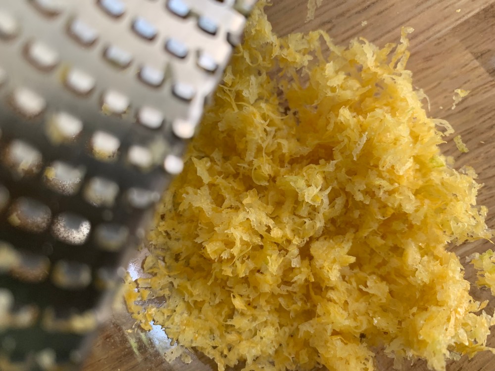 Prélever le zeste des citrons à l’aide d’une râpe et réserver dans un bol. Presser le jus et réserver dans un autre bol.