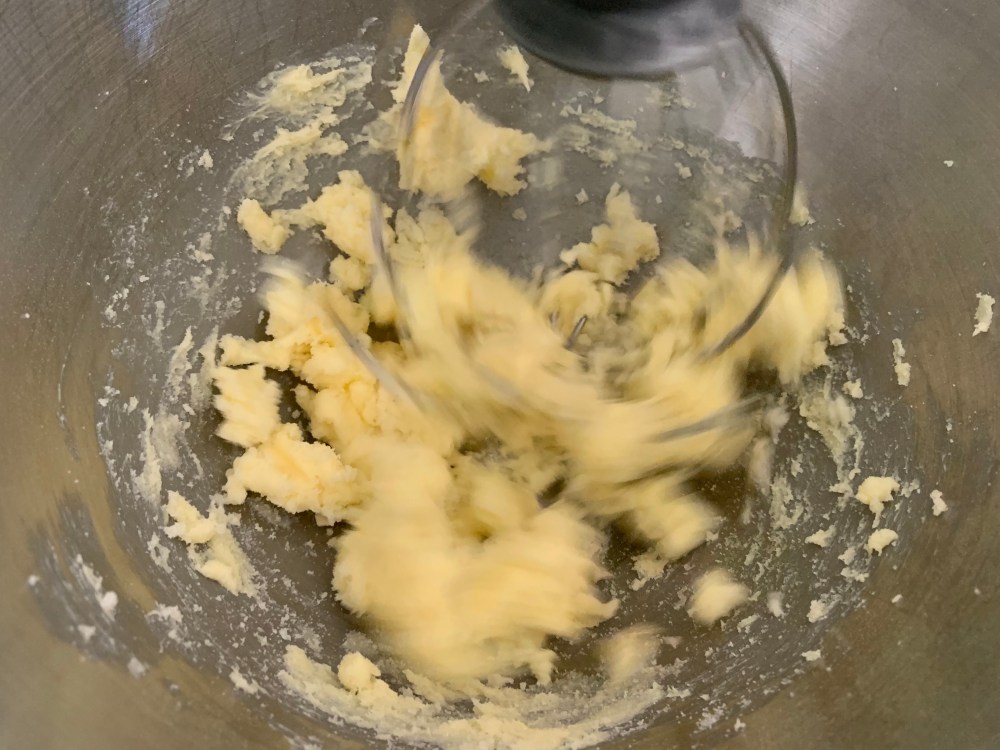 Dans un récipient, ou le bol de votre robot, mélanger le beurre et le sucre. J’ai utilisé le fouet du robot Kitchenaid tout le long.