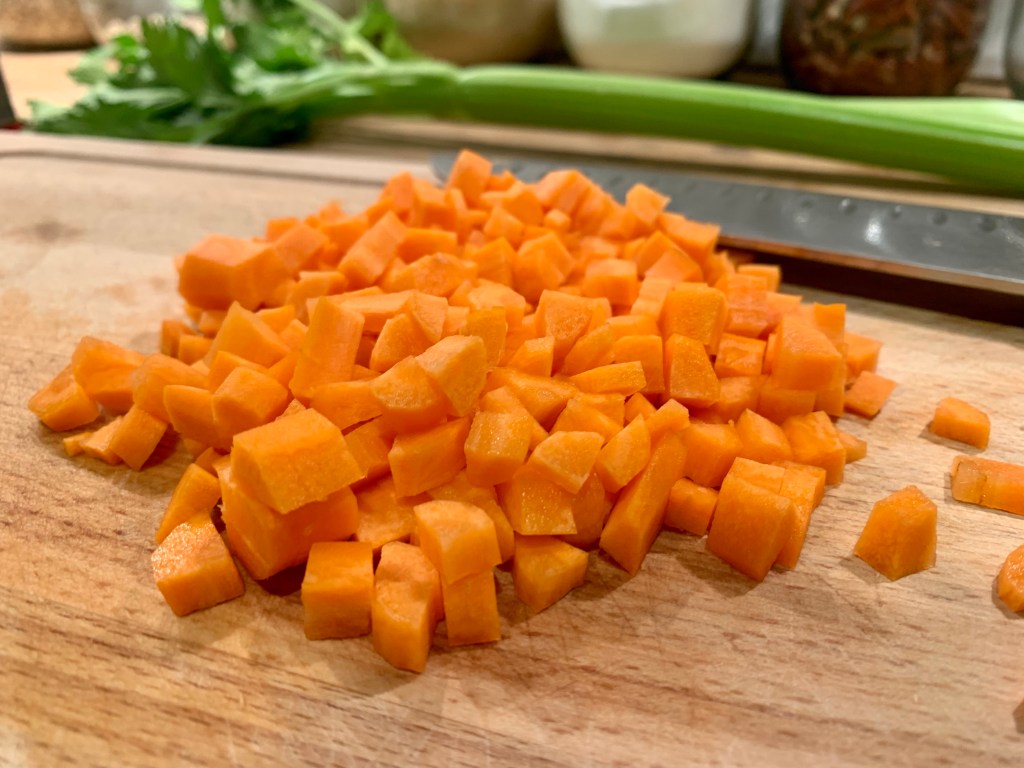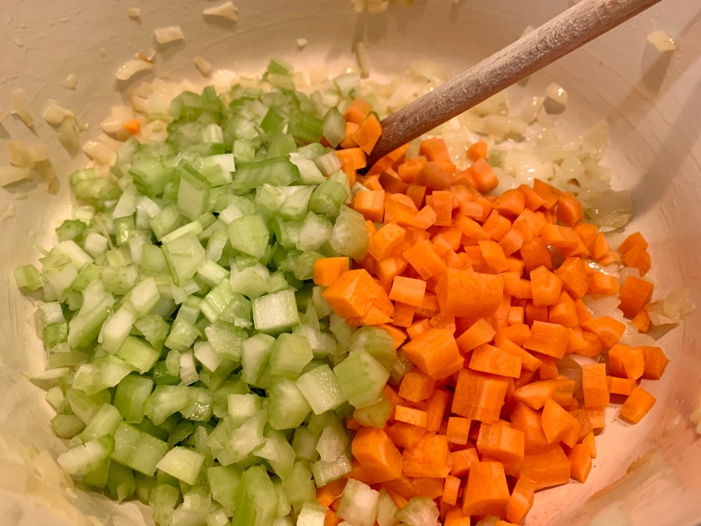 Couper les oignons, les carottes et le céleri en petit dés.