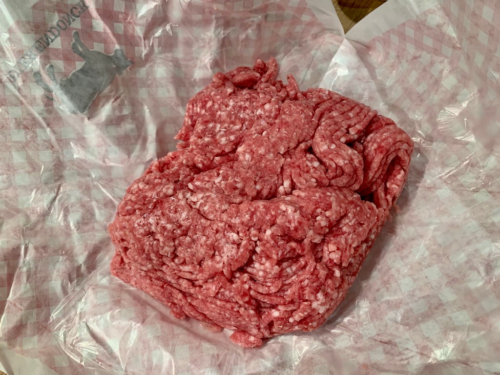 Pour la viande, je prends généralement de l’américain pur (bœuf maigre, le meilleur selon moi). Cette fois, c’est un mélange porc-bœuf.