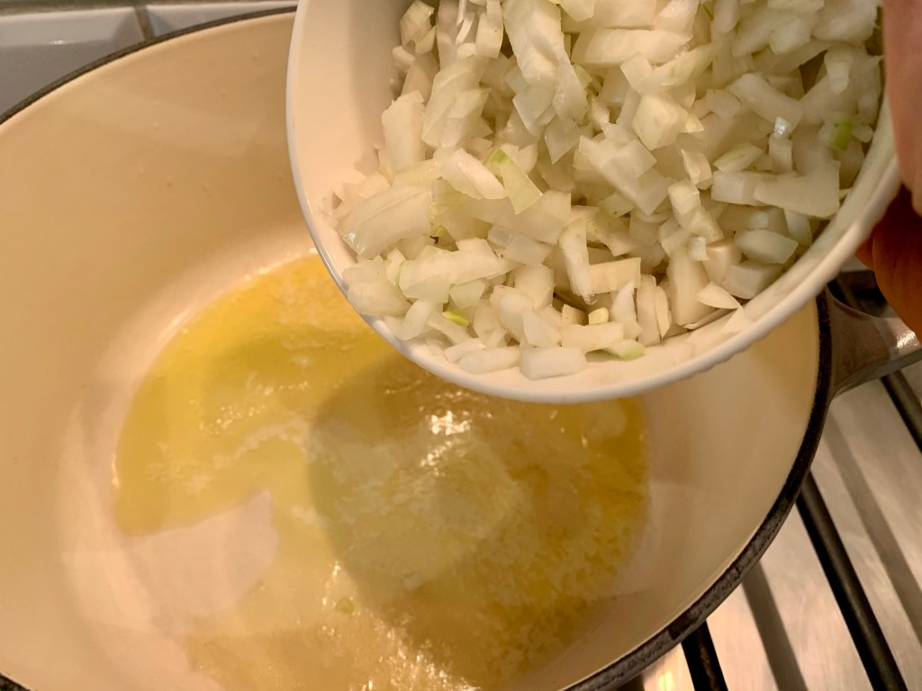 Mettre le beurre et l’huile à chauffer dans une casserole, à feu doux. Une fois que c’est fondu, ajouter les oignons et une pincée de sel. Faire cuire durant 5 minutes, à couvert.