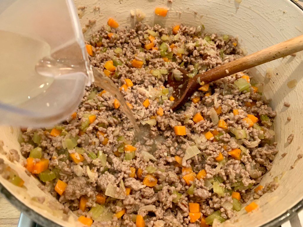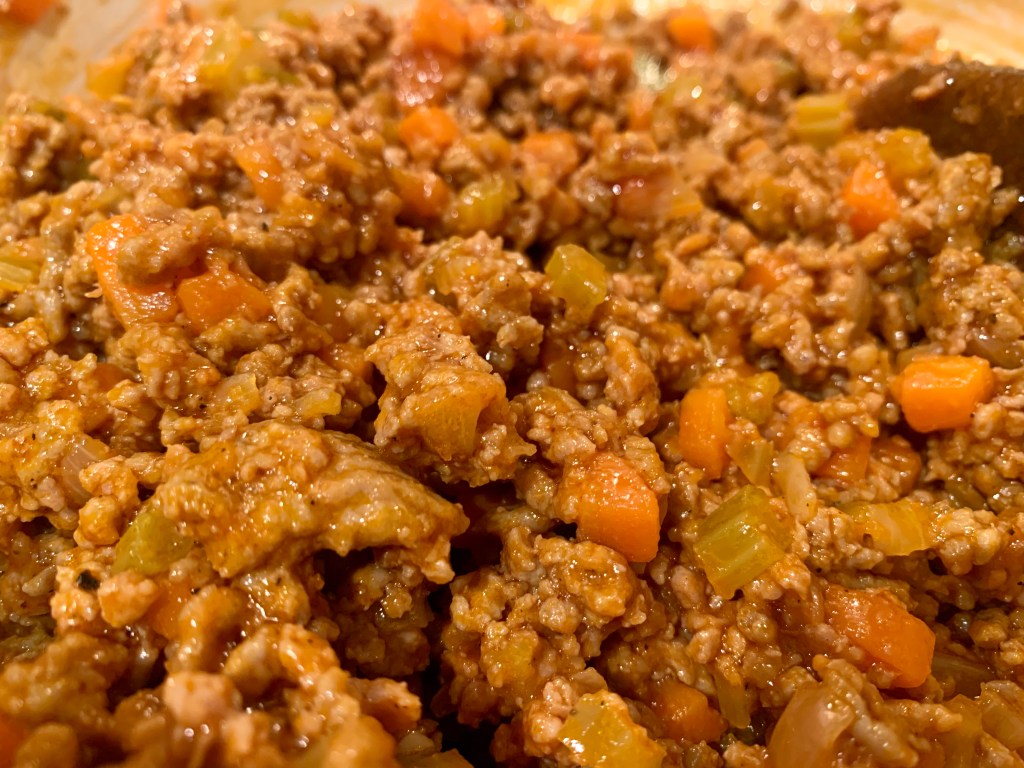 Je mets un peu moins de matière grasse qu’indiqué (surtout s’il s’agit d’un mélange de viandes), un peu plus de concentré de tomates…