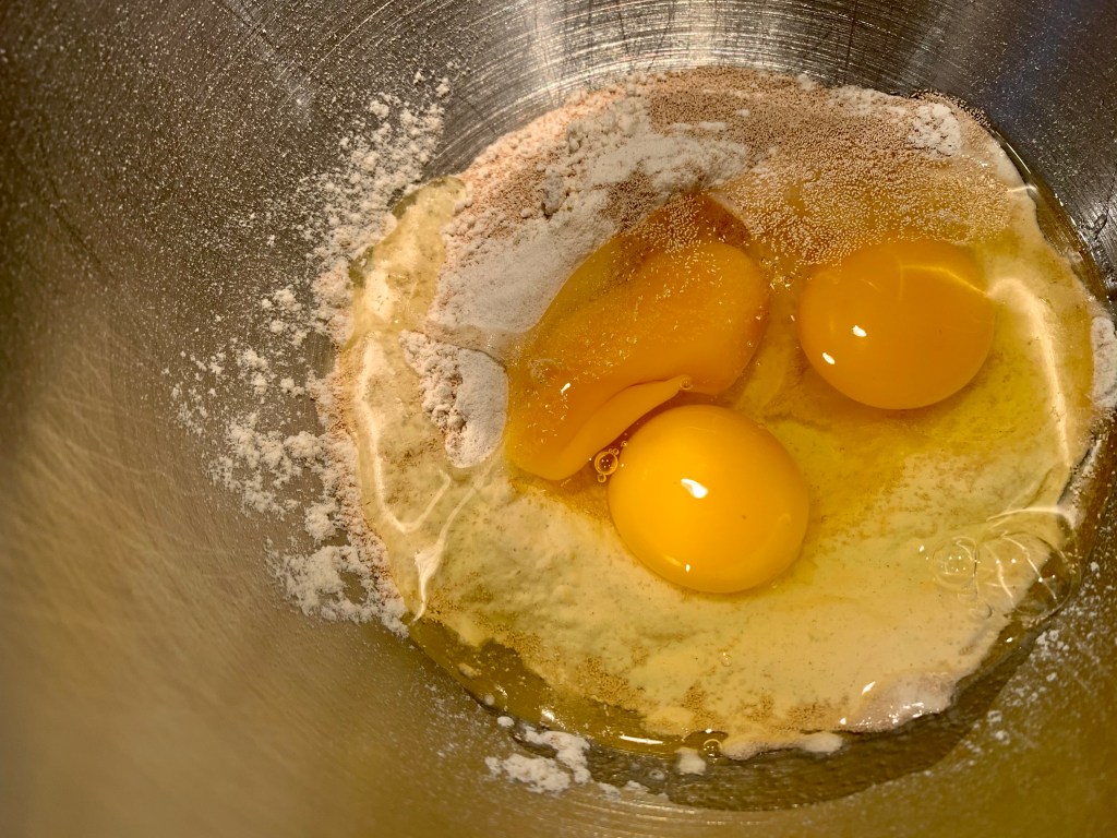 Dans le bol du robot, ou dans un bol tout court, mettre la farine, la levure et les œufs. Mélanger au fouet, vitesse moyenne.