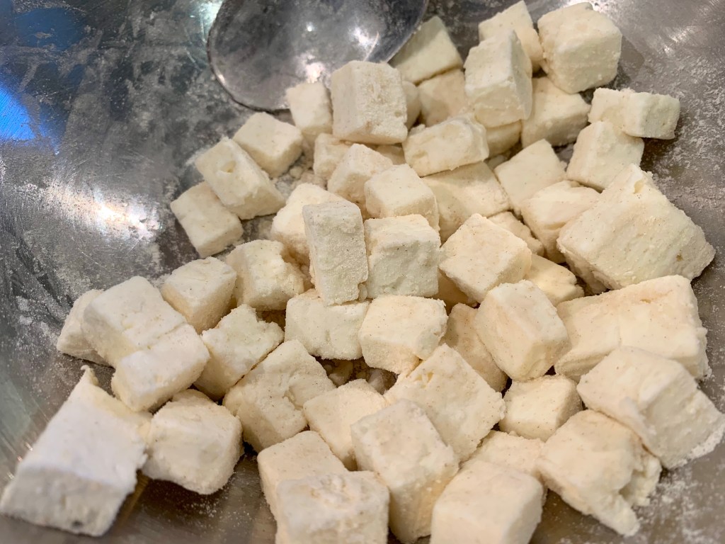 Couper la feta en petit dés, et dans un bol, les mélanger à une cuillère à soupe de farine. Comme ça, les cubes de feta restent entiers et ne tombent pas dans le fond du moule.