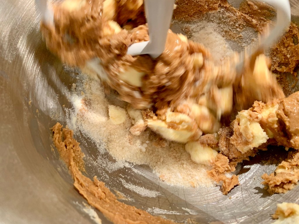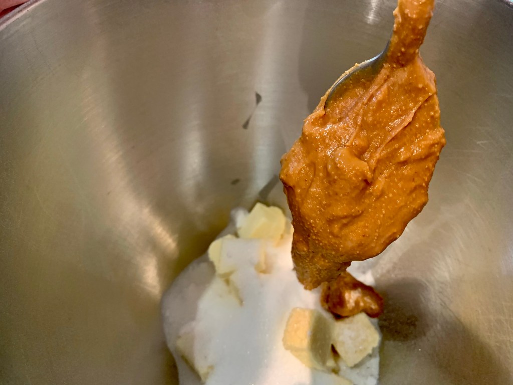 Dans le bol du robot, mettre le beurre (sorti préalablement du frigo, un peu ramolli), coupé en cubes, le sucre blanc, le sucre de canne et le beurre de cacahuÚtes.