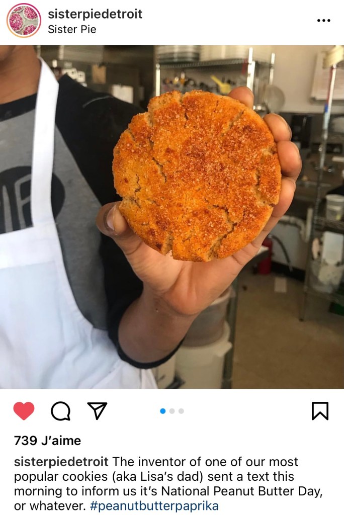 La recette originale vient d’une pĂątisserie de Detroit, « Sister Pie« . Apparemment c’est leur cookie signature. J’ai Ă©tĂ© voir ce qu’ils faisaient. Si j’habitais Ă Detroit, bein j’y serais souvent.