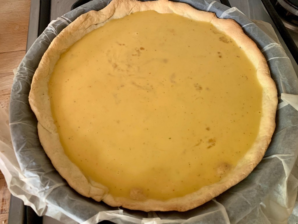 Une fois le fond de tarte cuit, y verser le mélange œufs – crème.