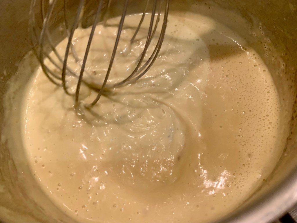 Ajouter le lait bouillant au mélange tout en fouettant.